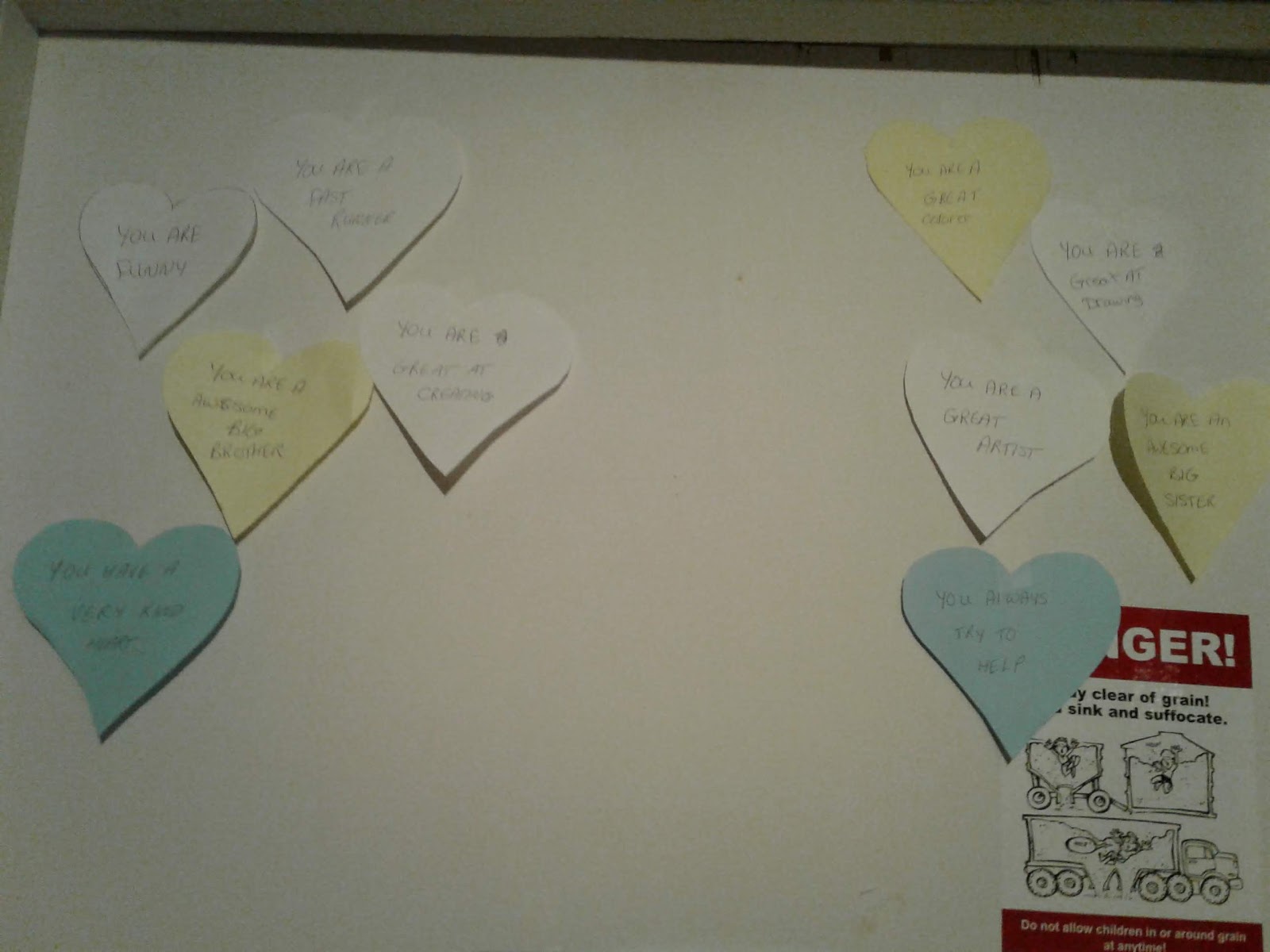 I have pre cut out hearts so all I need to do is the writting! With this every night or morning I tape a heart saying what is unique and/or special about each child, and they look forward to reading the new heart to feel that “love”.