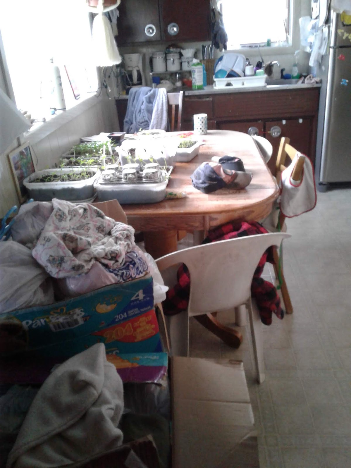So this is were my week sits, my kitchen is crazy as all those boxes are baby clothes I am sorting and selling, my plants need to wait till I get more dirt. That living room can wait as I need to get instance papers done today. And a phone call to get a repair man out for my washer. Ya washer is not working 😨 Yap you want real life I’m here for you this week.