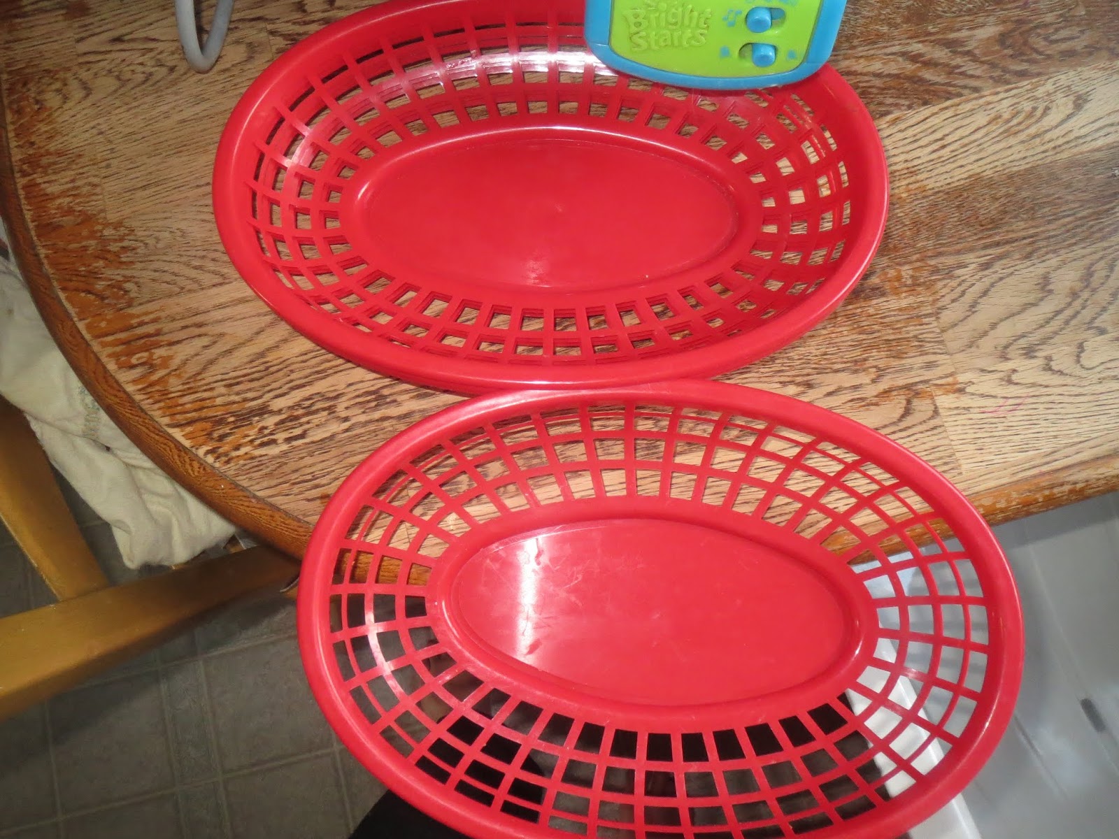 I have some paper clip together bowls that I got from a dollar store, and I have some baseball hotdog holders also from the dollar store.
